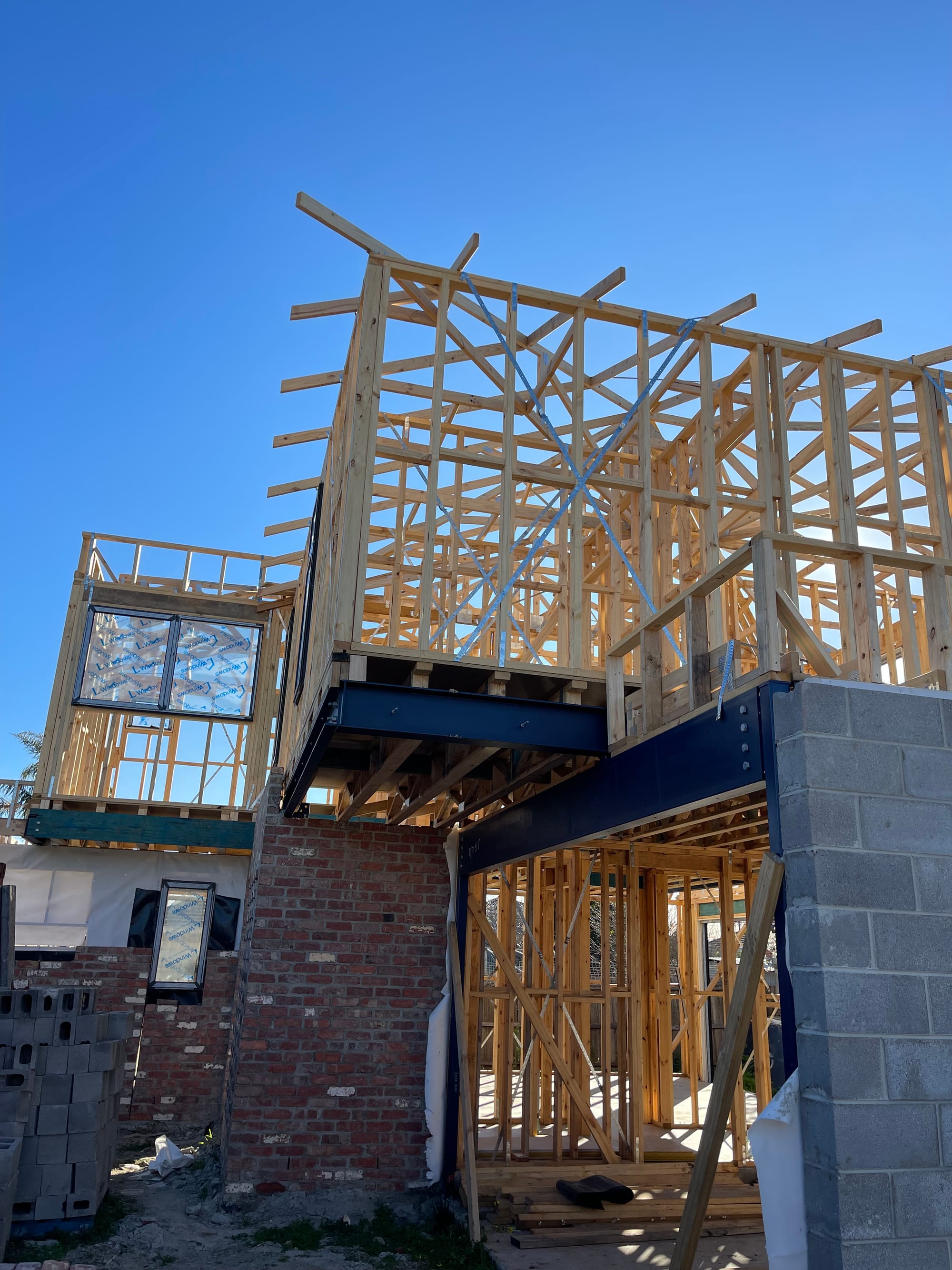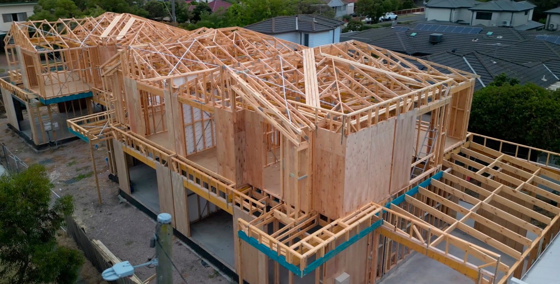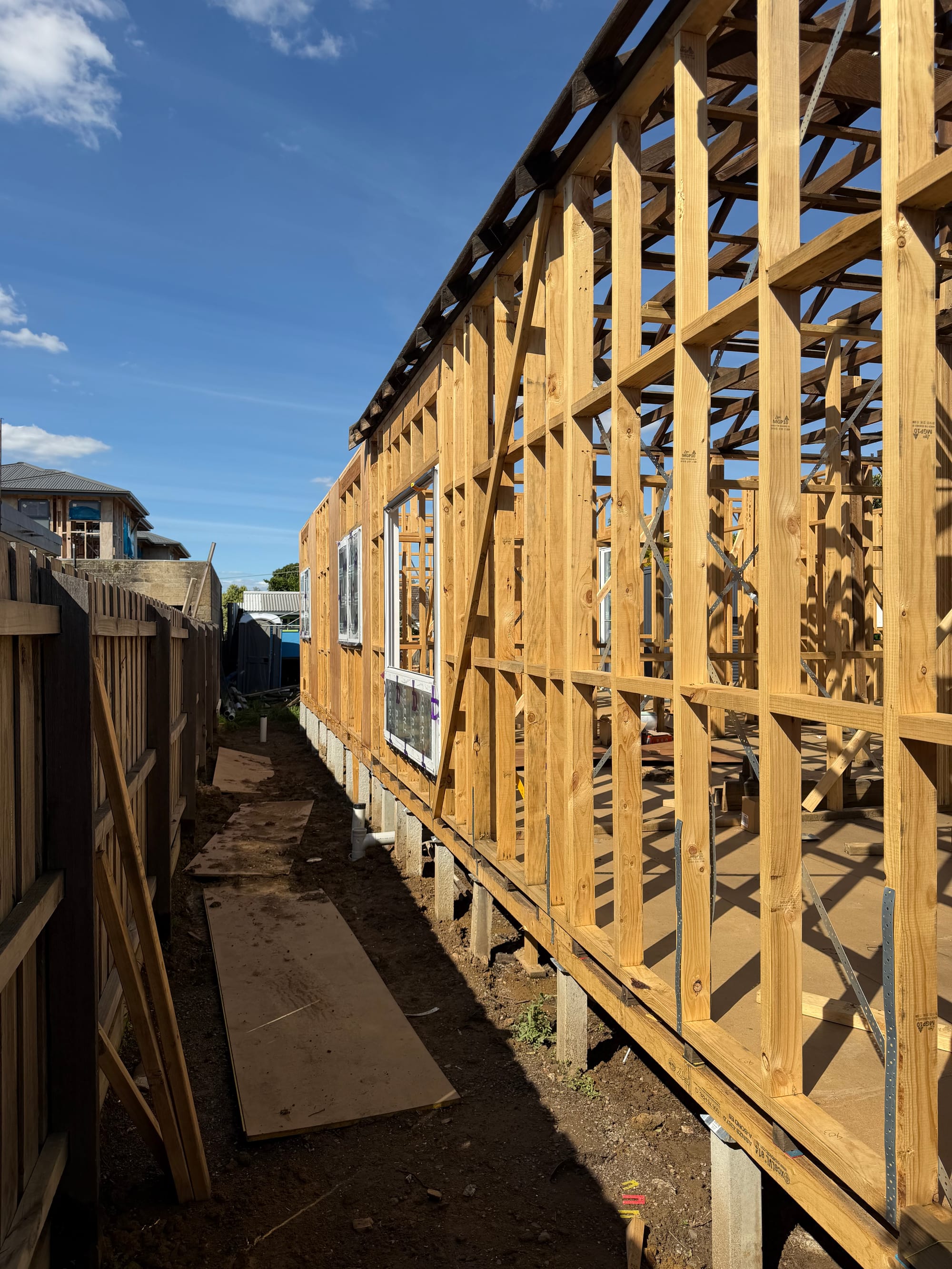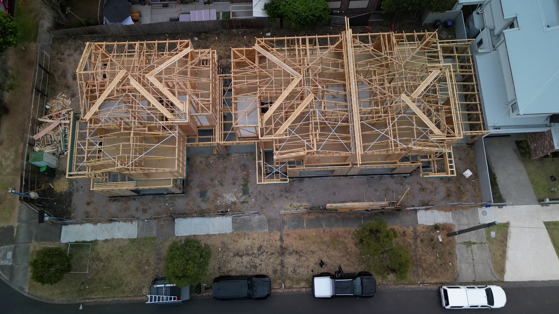 Structural framing works completed for 3x double story dwelling, with detailed attention to alignment, floor levels, and framing layout to ensure consistency across the build.