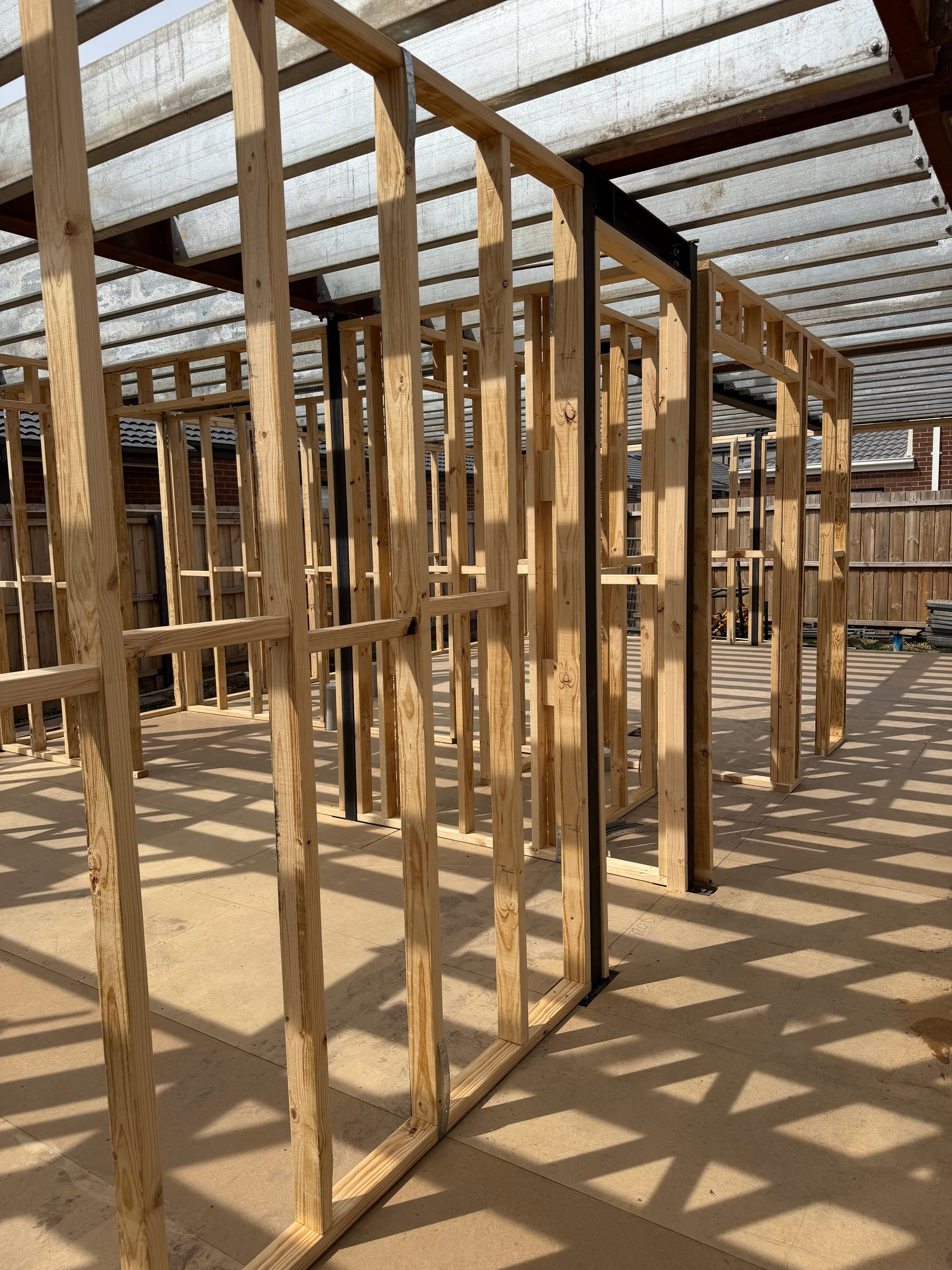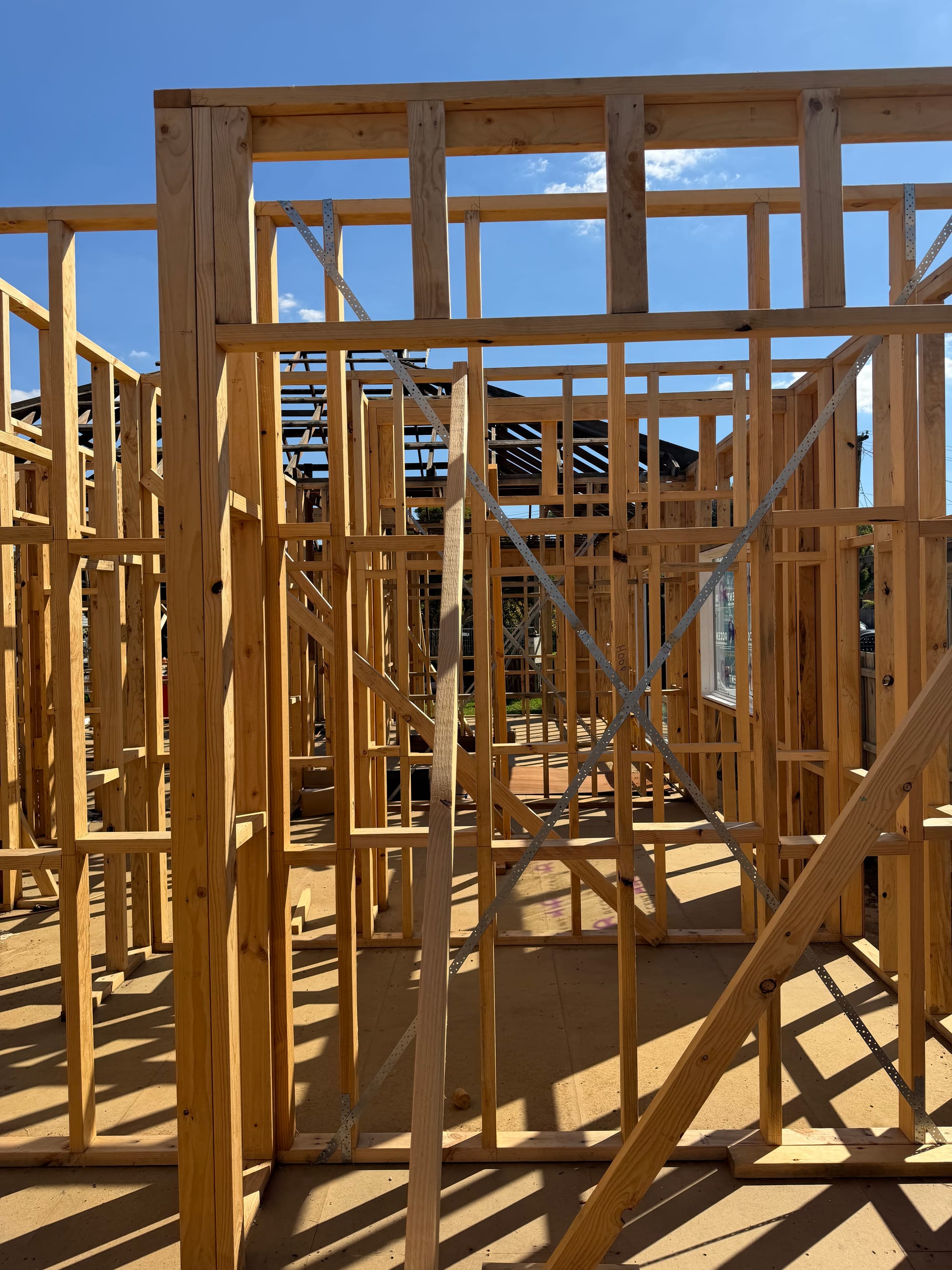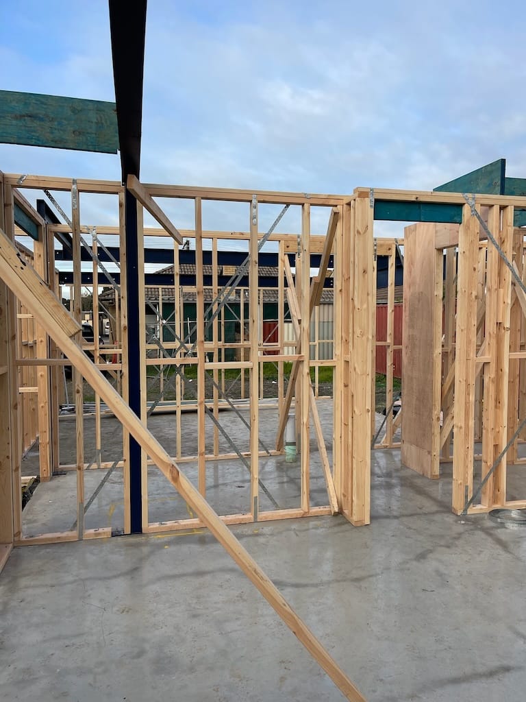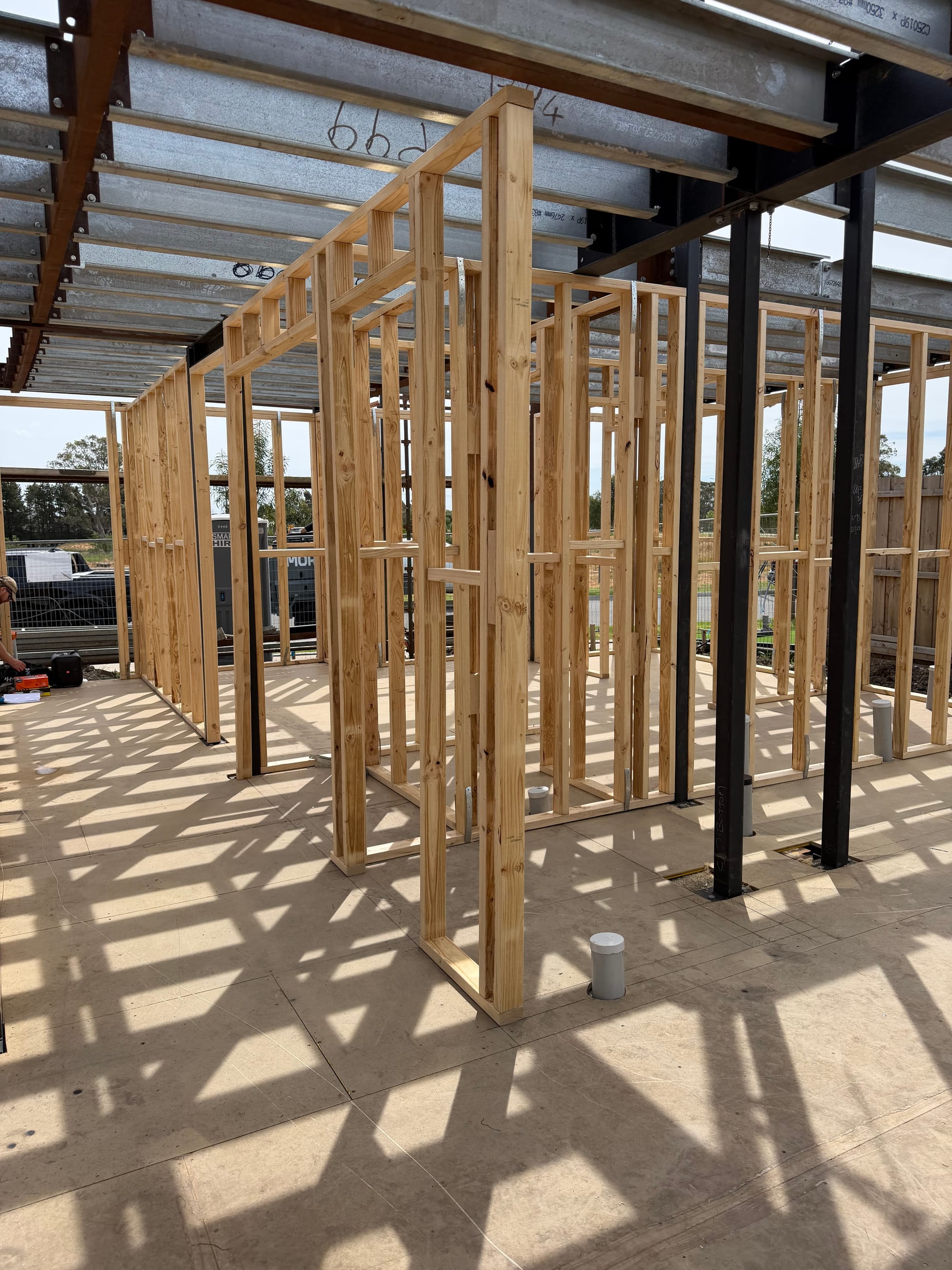 Structural framing works completed for 3x double story dwelling, with detailed attention to alignment, floor levels, and framing layout to ensure consistency across the build.
