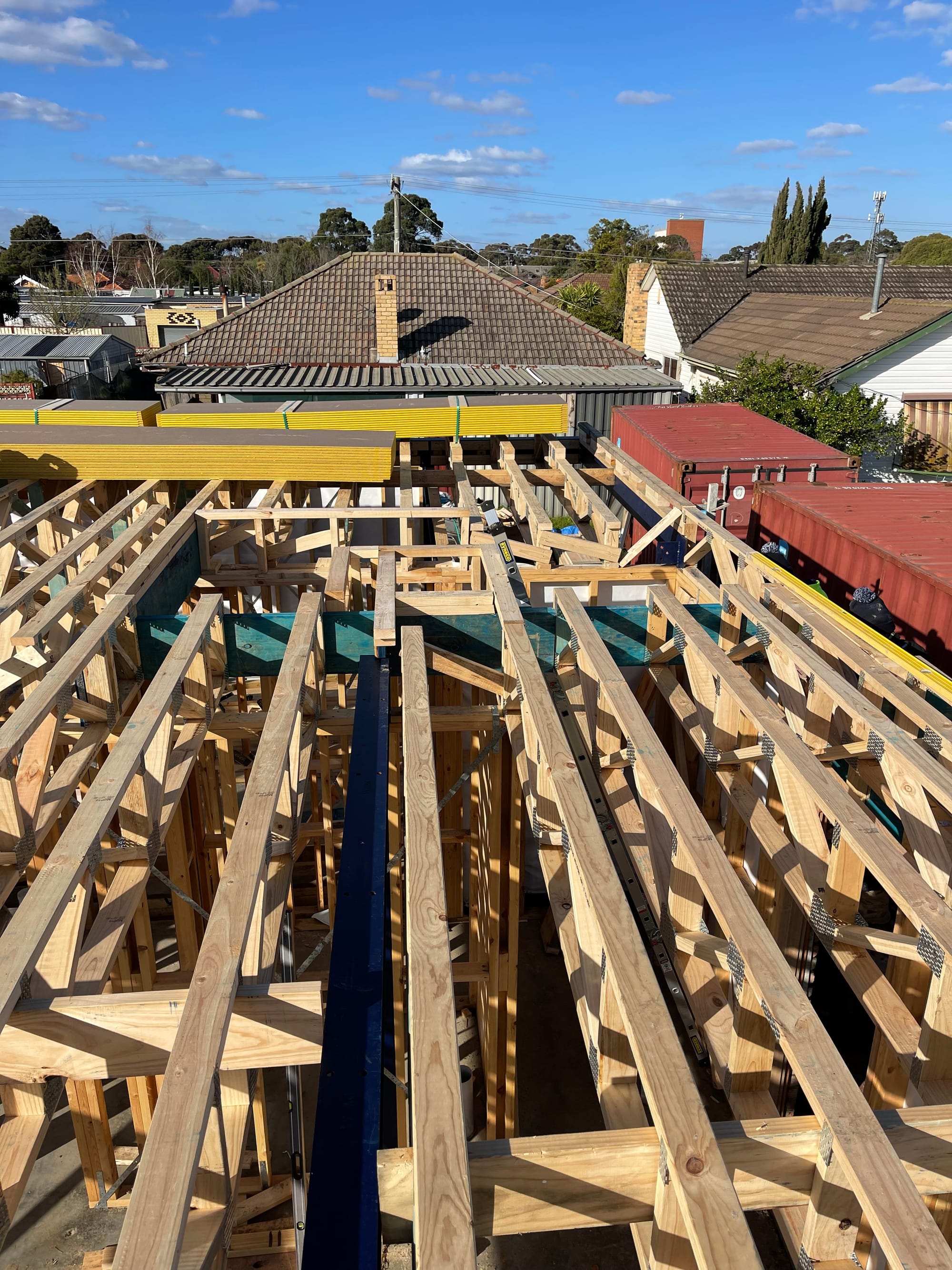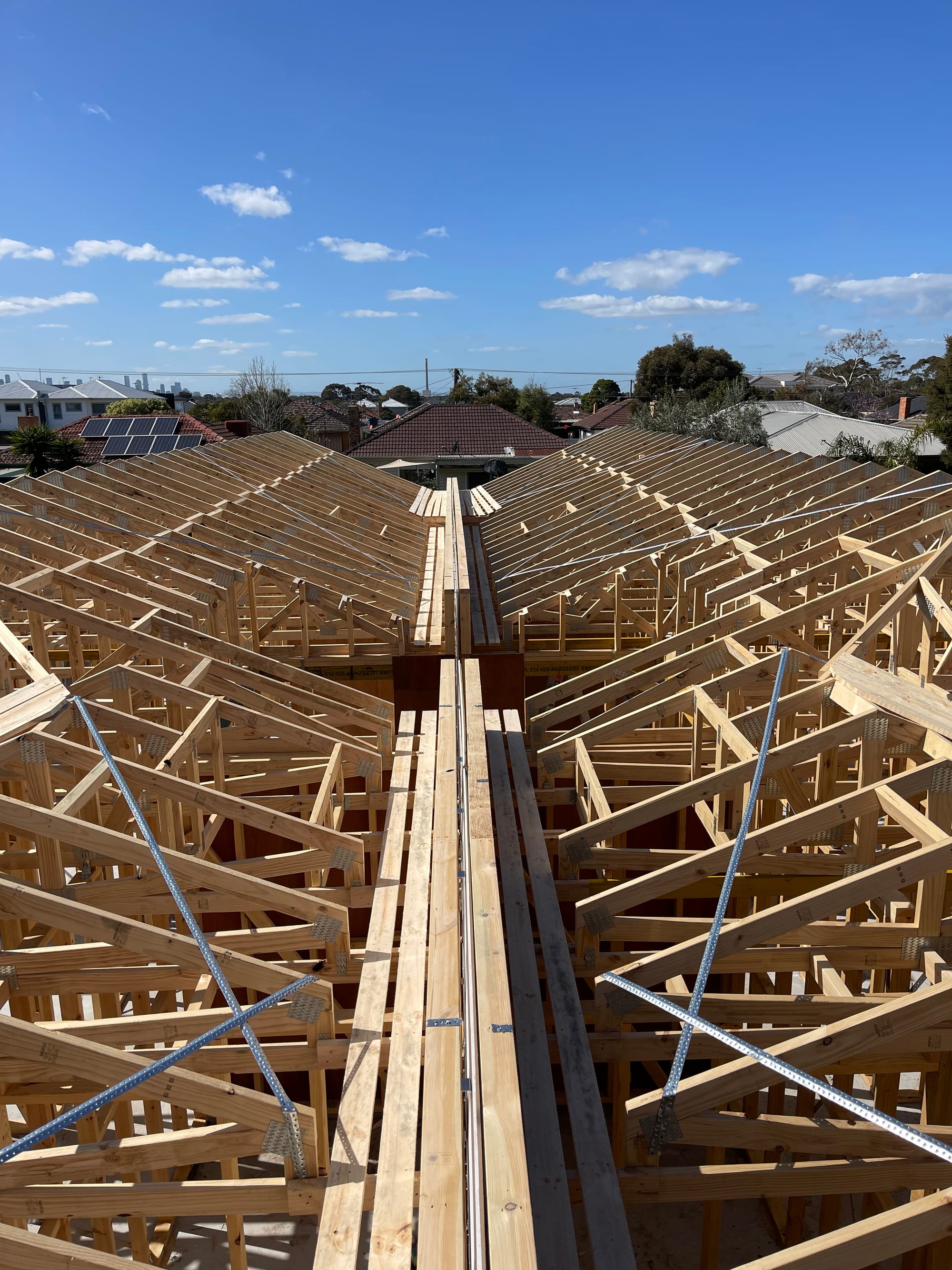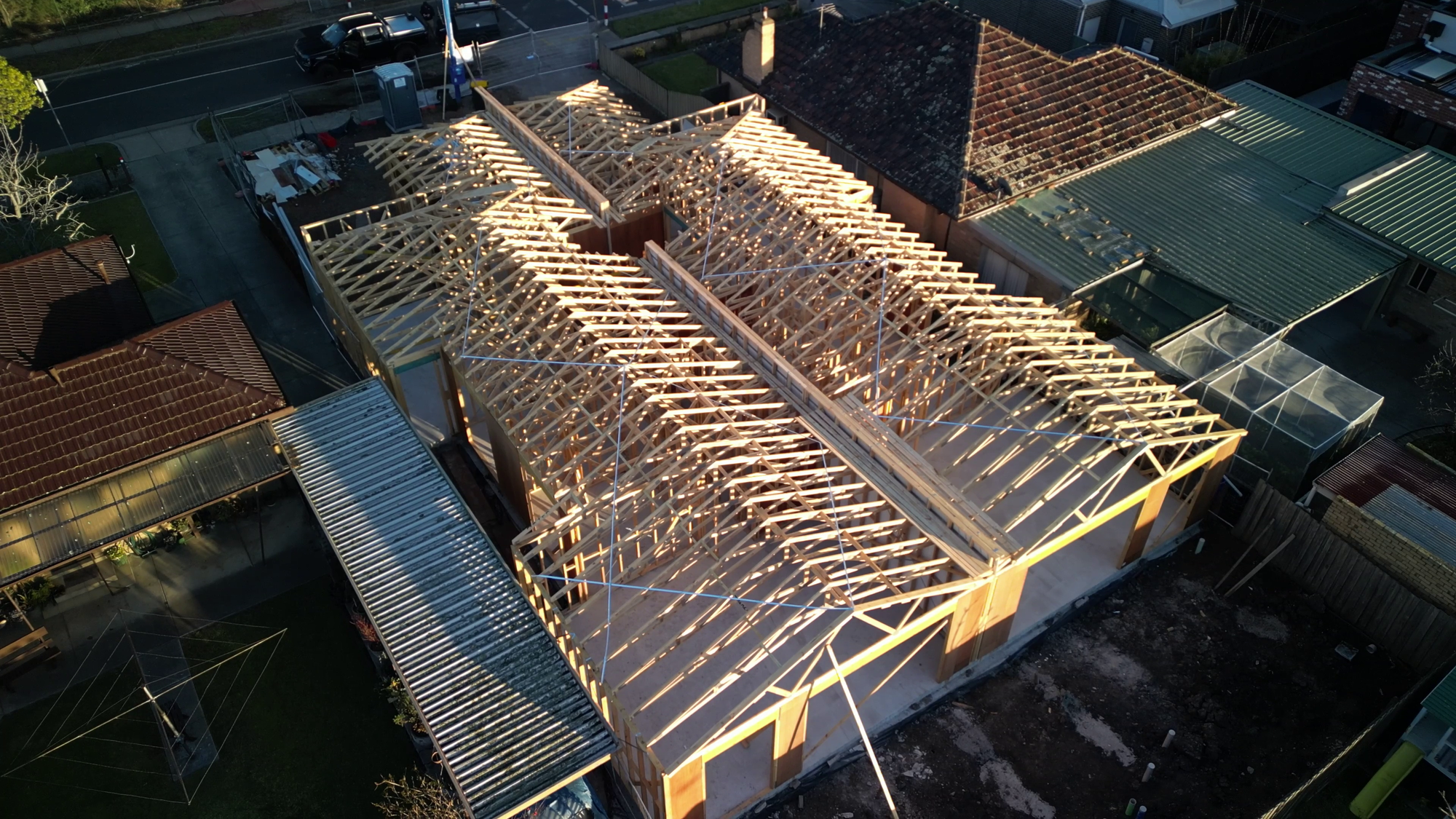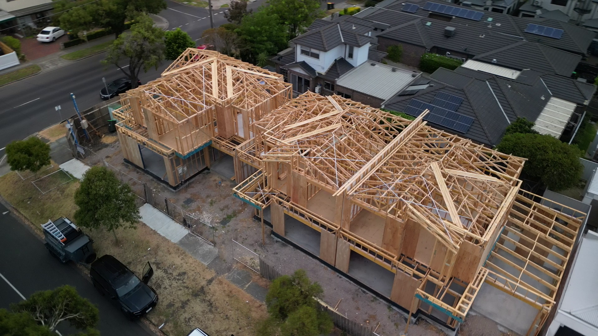 Two side-by-side single storey frames and roofs completed in Altona North, including wall frames, trusses, and roof structures, ready for the next stage.
