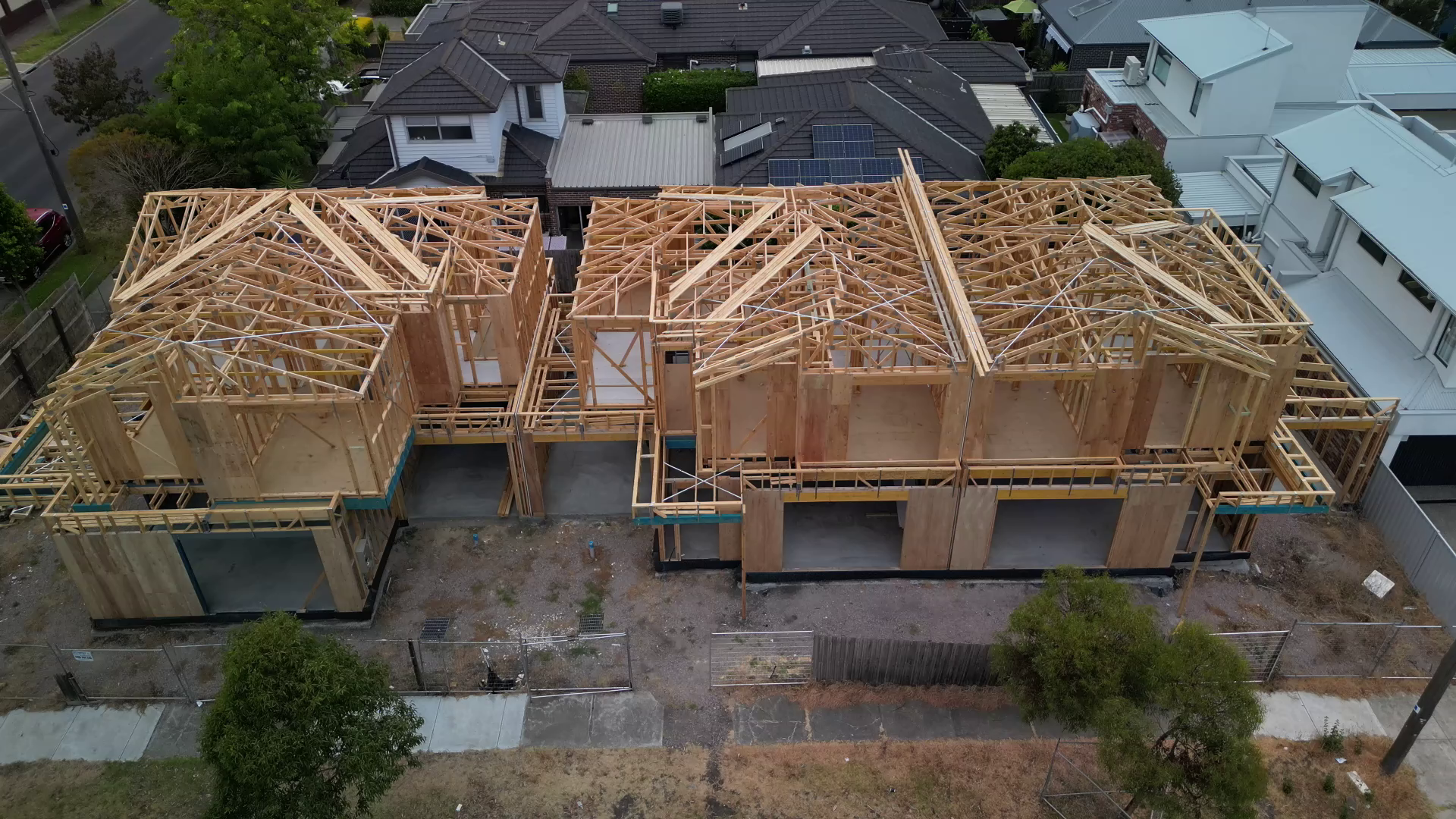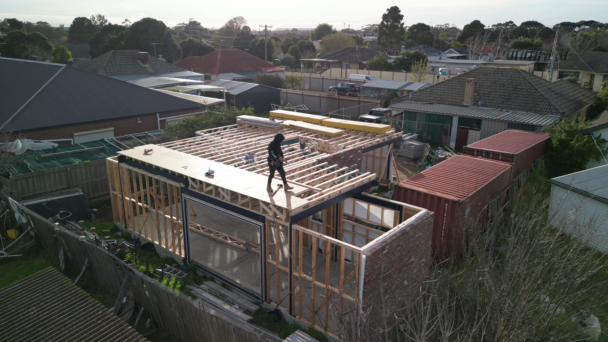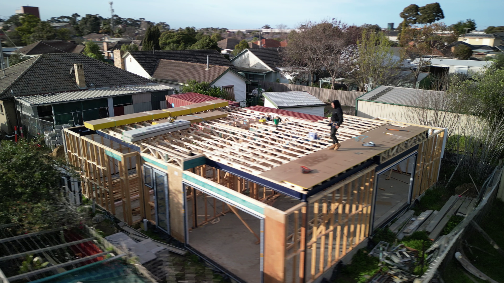 Two side-by-side single storey frames and roofs completed in Altona North, including wall frames, trusses, and roof structures, ready for the next stage.