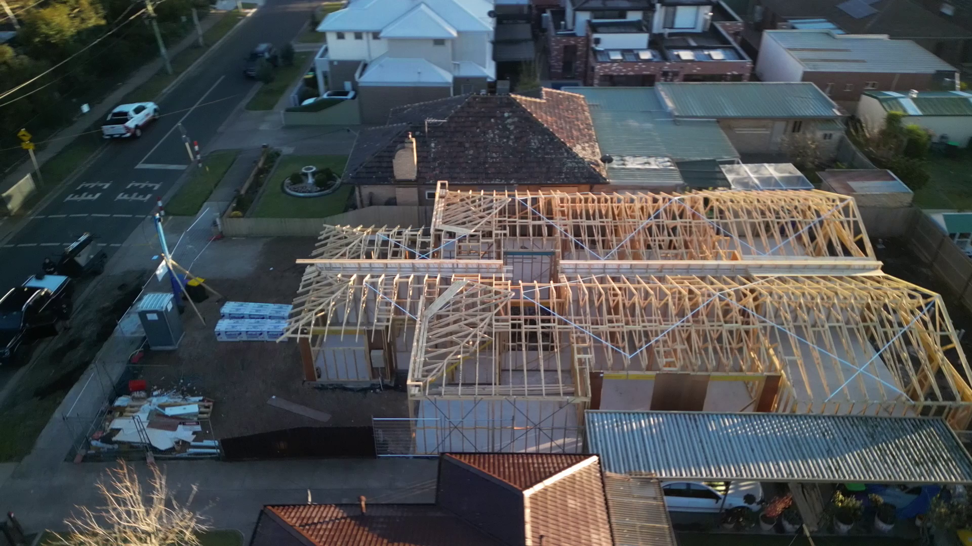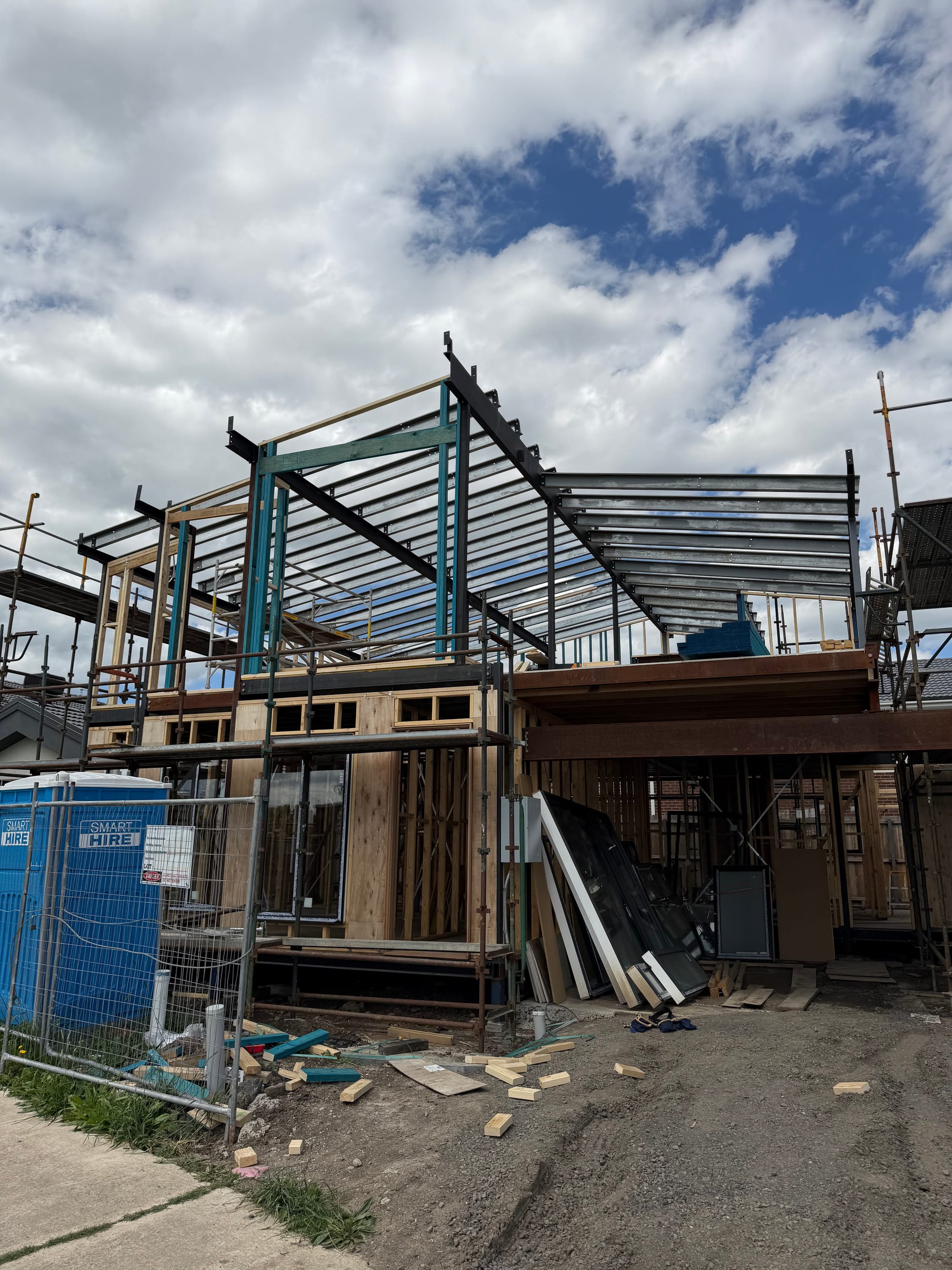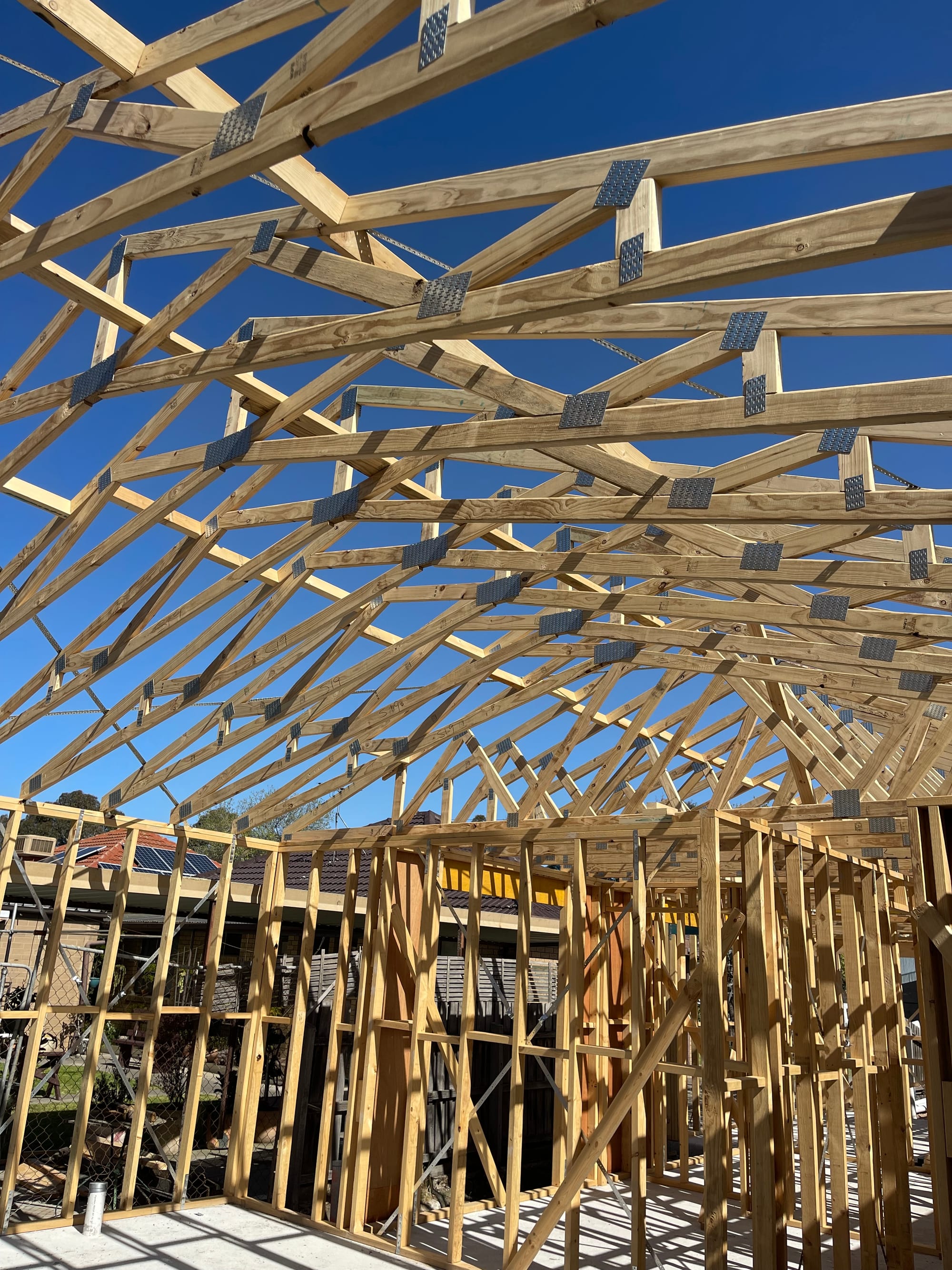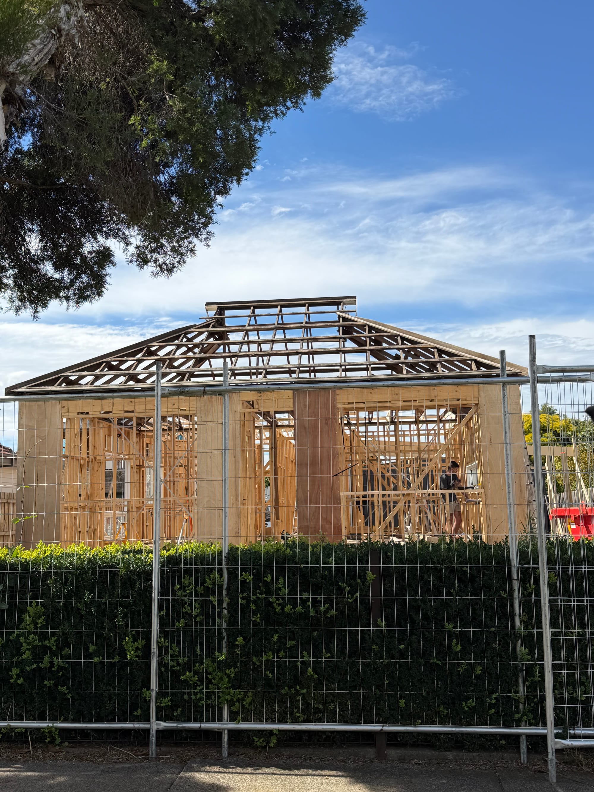 Two side-by-side single storey frames and roofs completed in Altona North, including wall frames, trusses, and roof structures, ready for the next stage.