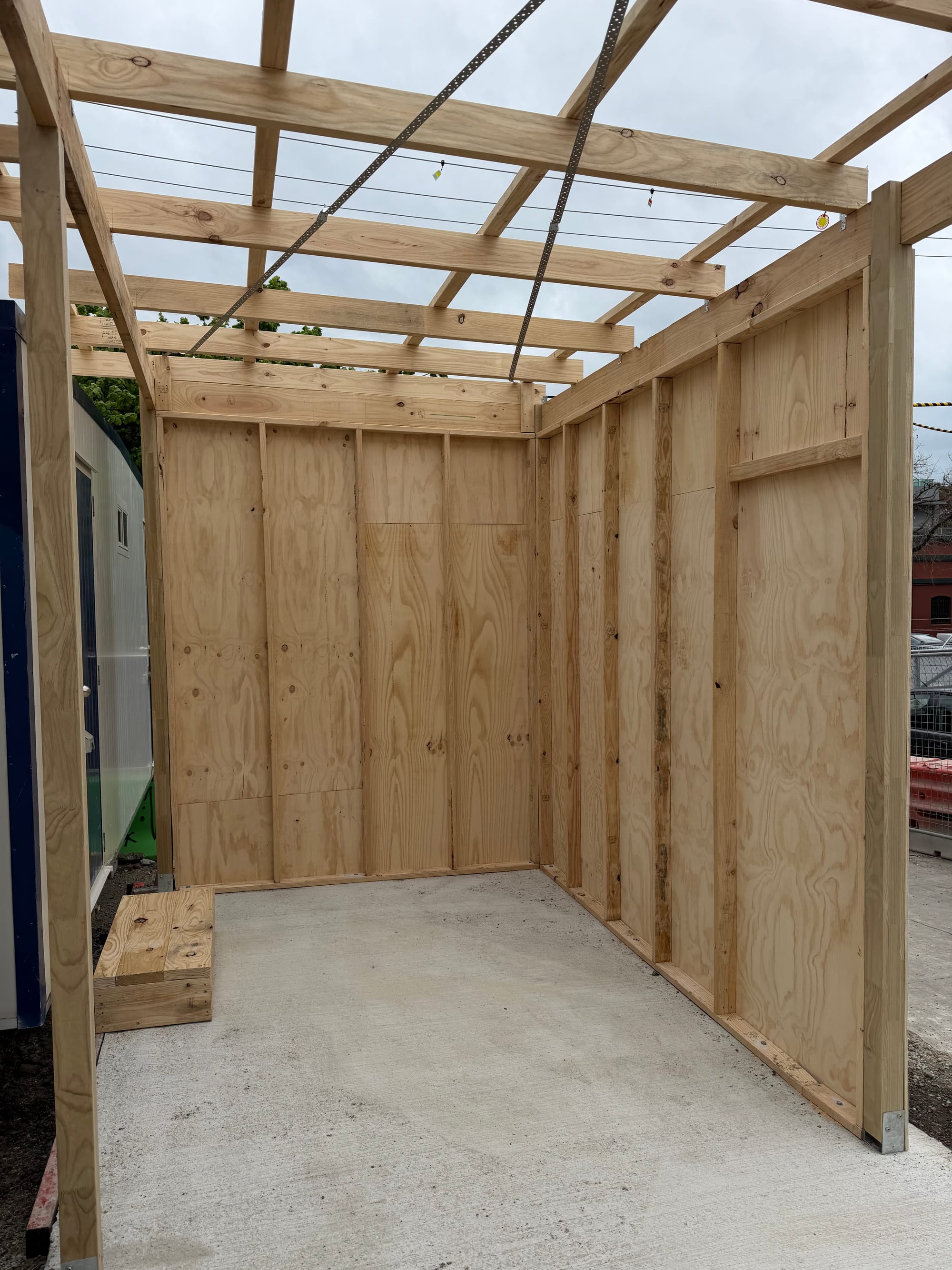 Undercover walkway completed for a Hickory site, including structural framing, sheeted roofing, and enclosed walls to provide protected access across the work area.