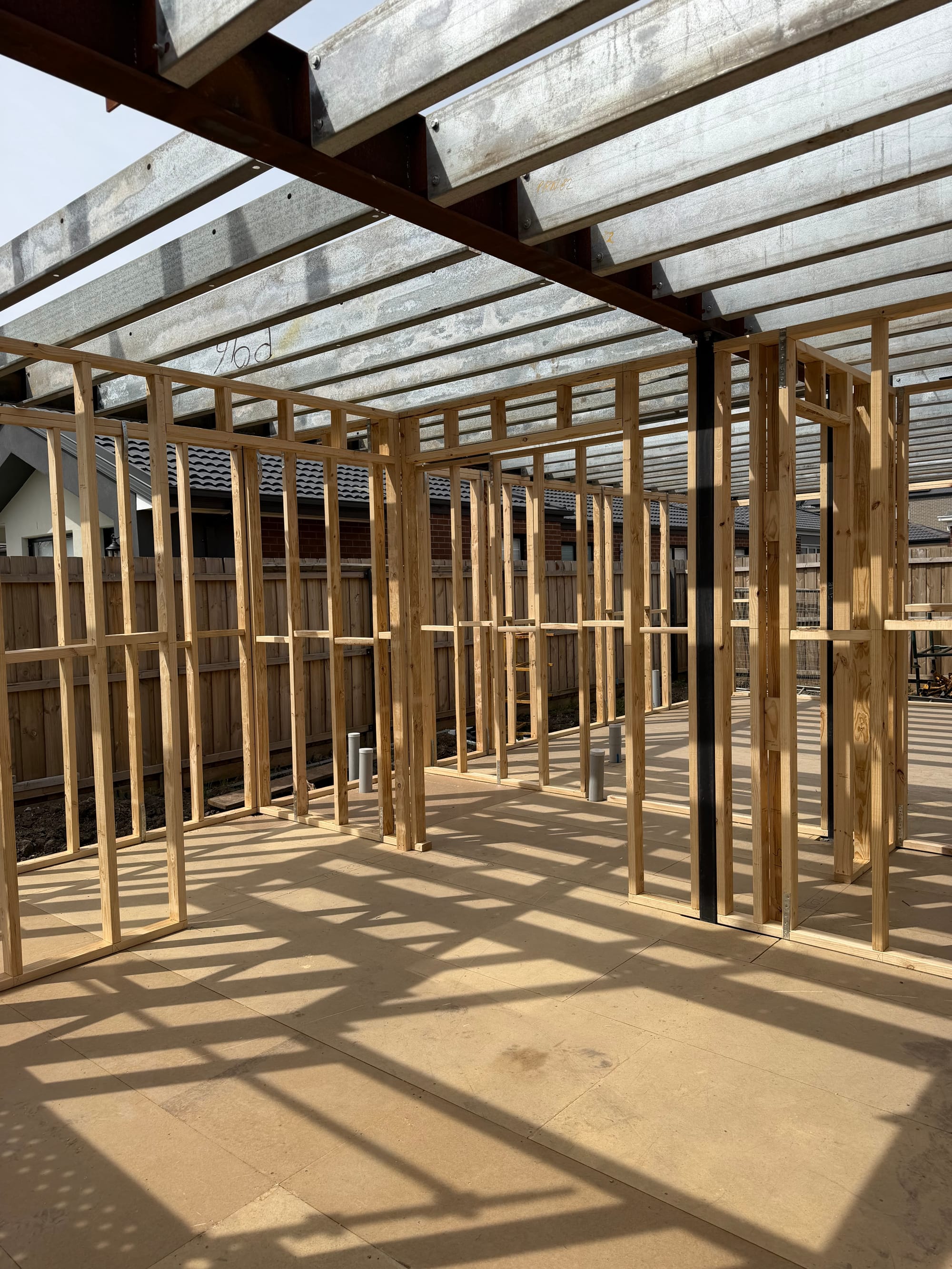 Full house framing completed in Wollert, including ground and upper-level structure, ready for roofing and cladding.
