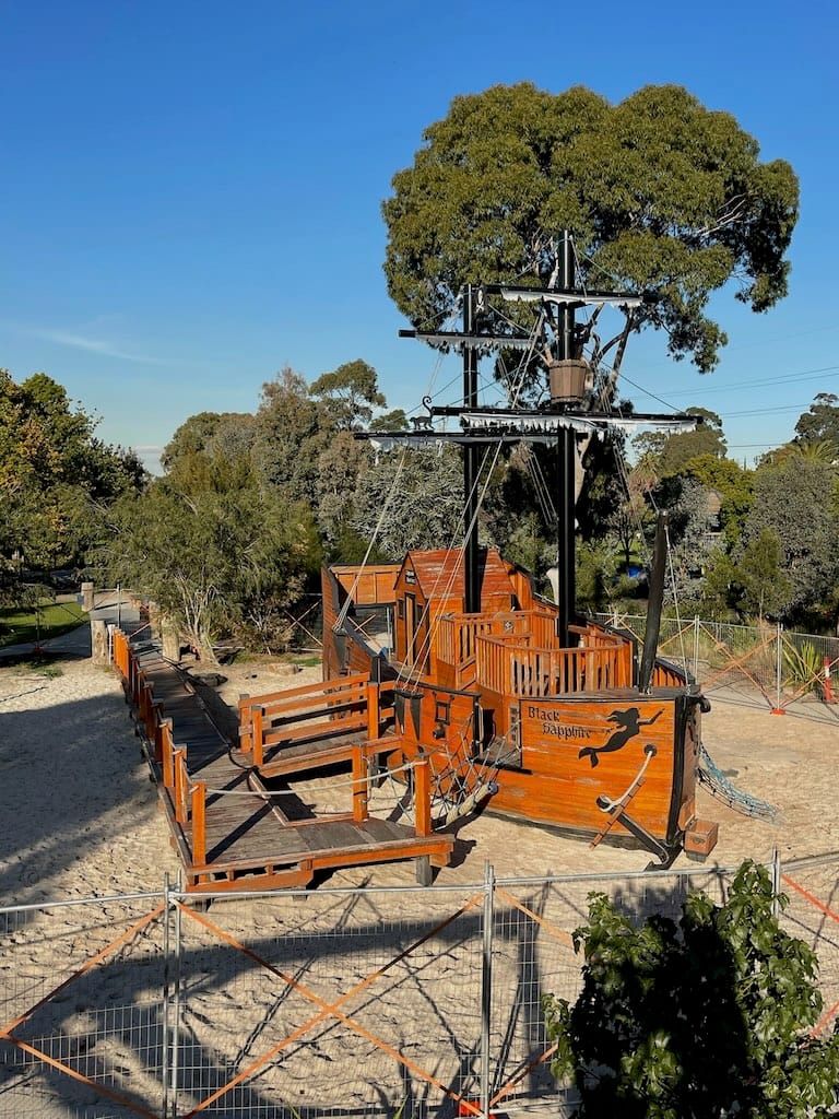 Refurbishment of a community playground pirate ship, featuring upgraded safety elements, brand-new decking, and high-quality refreshed finishes, bringing the structure back to life as a safe, durable, and engaging space for years of enjoyment.